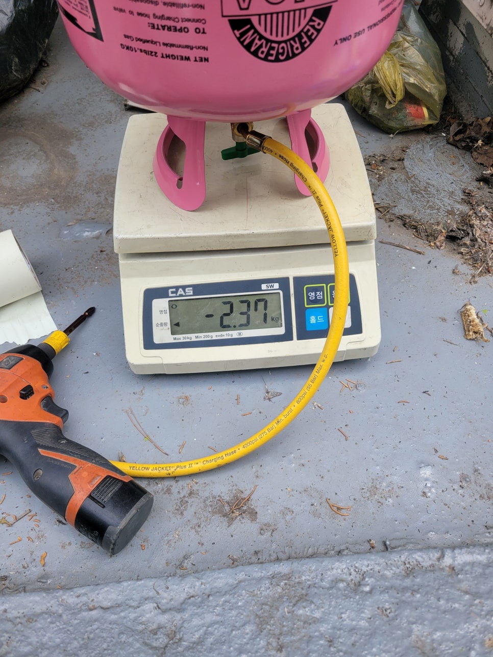 진공 작업 후에는 실외기에 표시된 정량만큼 정확히 냉매를 충전합니다. 눈대중으로 충전하는 것은 금물이며, 전자저울을 사용해 정밀하게 주입해야 합니다 .