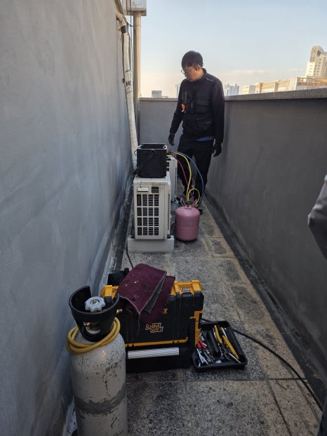 수리가 완료되면 반드시 진공 작업을 해야 합니다. 진공펌프를 이용해 배관 내부의 수분과 공기를 제거하는 과정으로, 이 단계를 생략하면 냉매 순환에 문제가 생길 수 있습니다 .