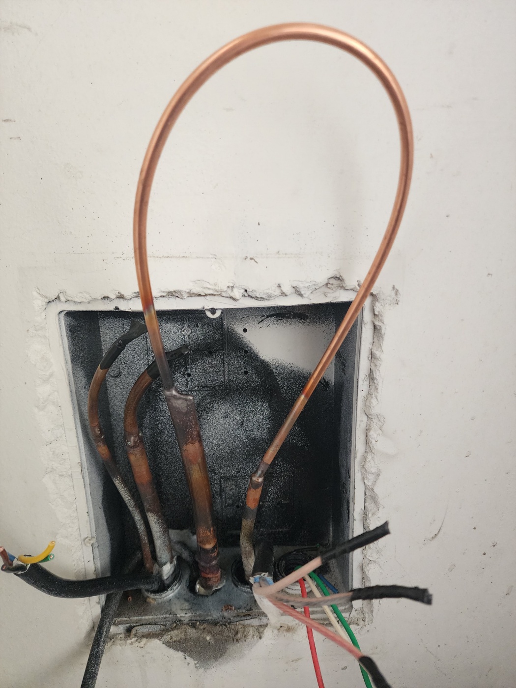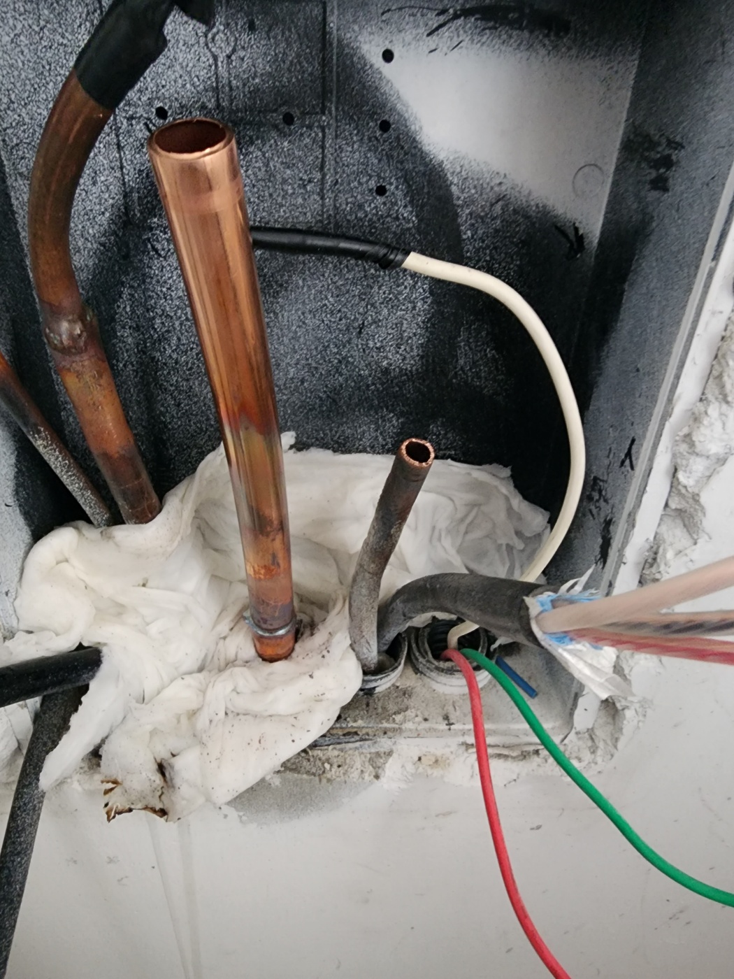 신축 당시 시공 불량으로 배관이 과하게 꺾여(Kink) 매립된 경우입니다. 꺾인 부위는 냉매의 흐름을 방해할 뿐만 아니라 압력이 집중되어 시간이 지나면 반드시 가스 누수로 이어집니다.