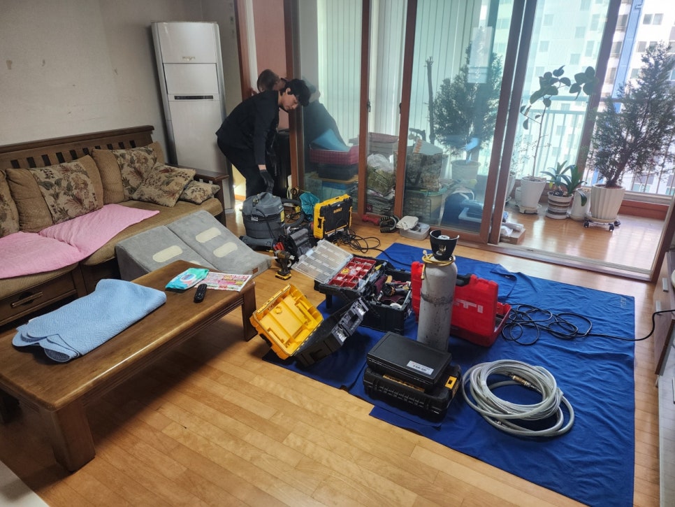 가전/가구 보양 및 대야 받치기: 물이 떨어지는 위치 아래에 있는 고가의 가전제품, 소파, 침대 등을 즉시 안전한 곳으로 이동시키세요. 물이 바닥으로 스며들지 않도록 넓은 대야를 여러 개 받치고 주변에 수건을 깔아두어야 합니다.