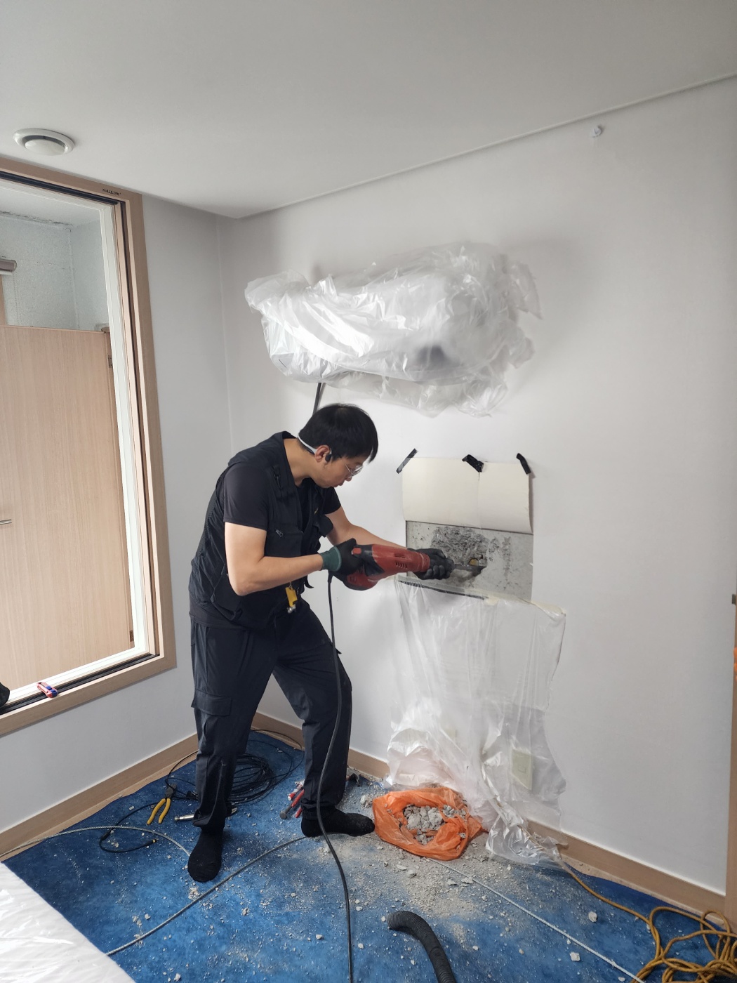 가장 까다로운 매립 물배관 누수는 뚝딱솔루션의 핵심 기술입니다. 정밀 탐지장비로 정확한 누수 위치를 찾아낸 후 최소 개방으로 수리합니다.