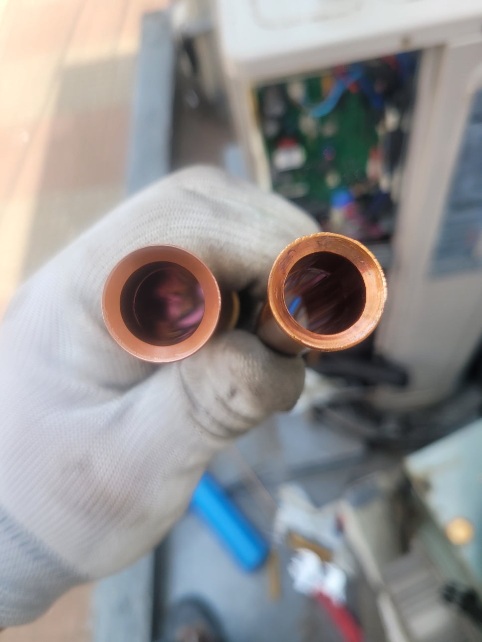 동관에 녹색 부식(산화물)이 생긴 부위 확인 (누설 흔적)