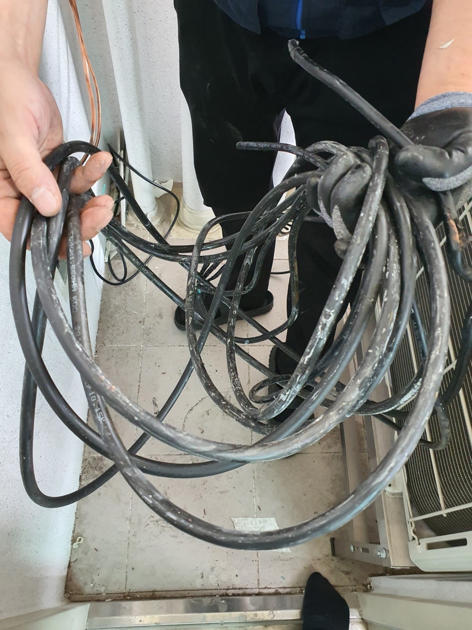 일반적으로 시스템에어컨 본체와 메인 PVC 배관을 연결하는 구간에는 구부리기 쉬운 플라스틱 재질의 주름 호스가 사용됩니다. 하지만 이 호스는 수년 동안 차가운 응축수와 덥고 습한 외부 공기의 극심한 온도 차를 겪으며, 서서히 플라스틱 특유의 탄력을 잃고 돌덩이처럼 딱딱하게 굳어버리는 '경화 현상'을 겪게 됩니다. 이렇게 수명을 다해 굳어버린 호스는 에어컨 펌프가 밀어내는 수압을 견디지 못하고 과자처럼 바스라지며 쩍쩍 갈라집니다. 갈라진 틈에 실리콘을 바르는 것은 며칠짜리 임시방편일 뿐, 썩은 구간을 완전히 절단하고 새 호스로 복원해야만 누수를 막을 수 있습니다.