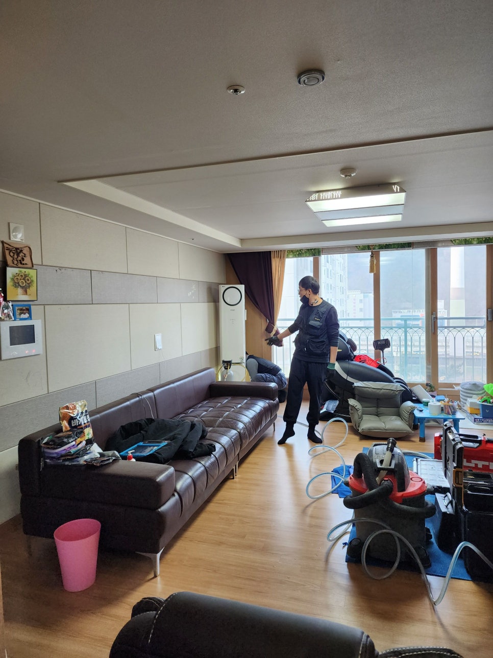 인테리어 공사나 리모델링 후에는 배수 호스가 건드려졌을 가능성이 있습니다. 공사 후 드레인 검사를 받아보는 것이 좋습니다.