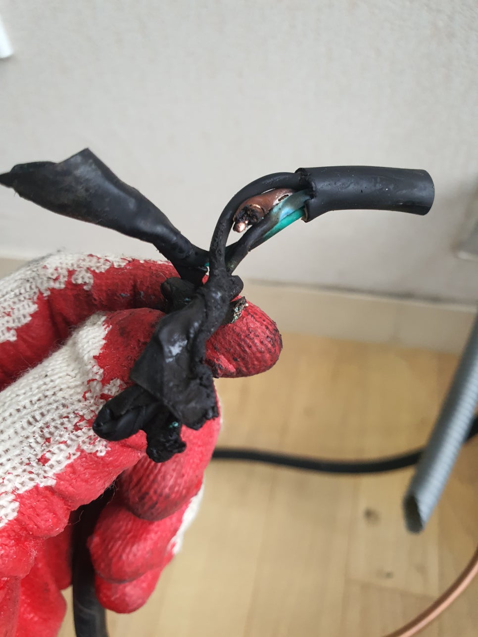 일반적으로 시스템에어컨 본체와 메인 PVC 배관을 연결하는 구간에는 구부리기 쉬운 플라스틱 재질의 주름 호스가 사용됩니다. 하지만 이 호스는 수년 동안 차가운 응축수와 덥고 습한 외부 공기의 극심한 온도 차를 겪으며, 서서히 플라스틱 특유의 탄력을 잃고 돌덩이처럼 딱딱하게 굳어버리는 '경화 현상'을 겪게 됩니다. 이렇게 수명을 다해 굳어버린 호스는 에어컨 펌프가 밀어내는 수압을 견디지 못하고 과자처럼 바스라지며 쩍쩍 갈라집니다. 갈라진 틈에 실리콘을 바르는 것은 며칠짜리 임시방편일 뿐, 썩은 구간을 완전히 절단하고 새 호스로 복원해야만 누수를 막을 수 있습니다.
