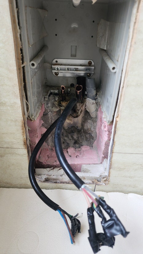 실외기 진동에 의한 지속적인 마찰 손상: 실외기가 세차게 돌아갈 때 발생하는 미세한 진동이 배관에 계속해서 스트레스를 줍니다. 만약 배관이 실외기 철판 케이스나 베란다 난간 등 주변 구조물과 맞닿아 있다면, 오랜 시간 동안 진동으로 인해 마찰이 일어나면서 그 부위가 닳고 닳아 결국 구멍이 나버립니다.