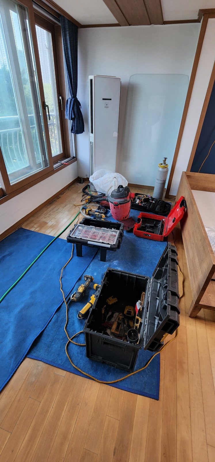 청소기 같이 생긴 고속 흡입기를 이용하여 에어컨 드레인 내부의 이물질을 제거하는 방법입니다. 가정 내 세대 드레인이 짧은 구간 막혔을 때 시도되는 방법입니다 .