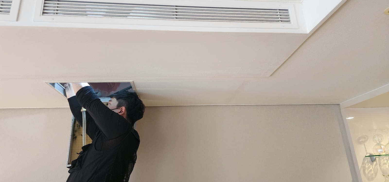 천장형 시스템 에어컨은 모든 배관과 호스가 천장 석고보드 안쪽에 숨겨져 있기 때문에, **'천장형에어컨물호스누수'**가 발생하면 육안으로 정확한 위치를 파악하기가 매우 어렵습니다. 방치하면 우리 집 거실 마루가 썩는 것은 물론, 아랫집 천장까지 침투해 수백만 원의 누수 피해보상을 해줘야 하는 끔찍한 상황으로 이어지기도 합니다.