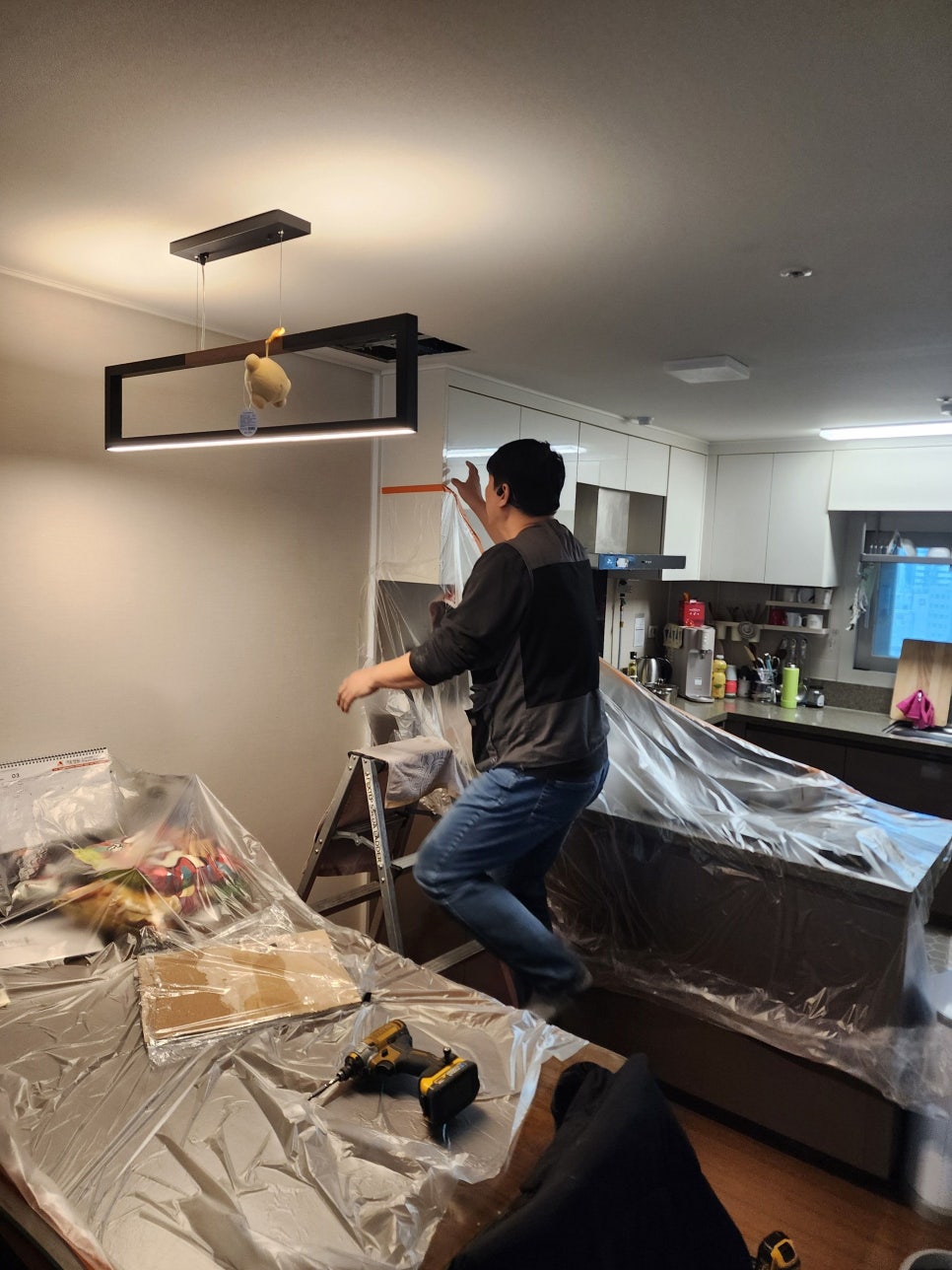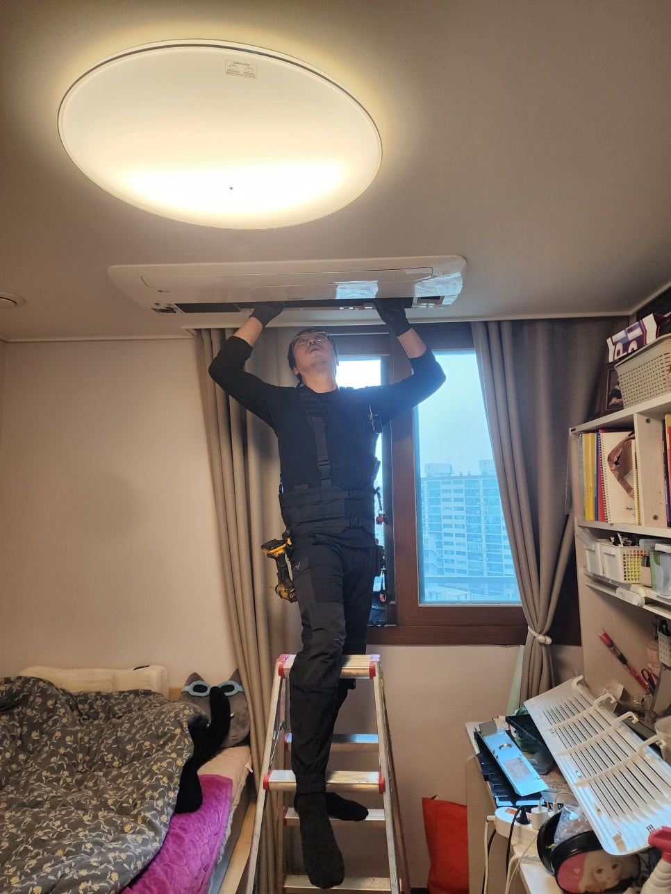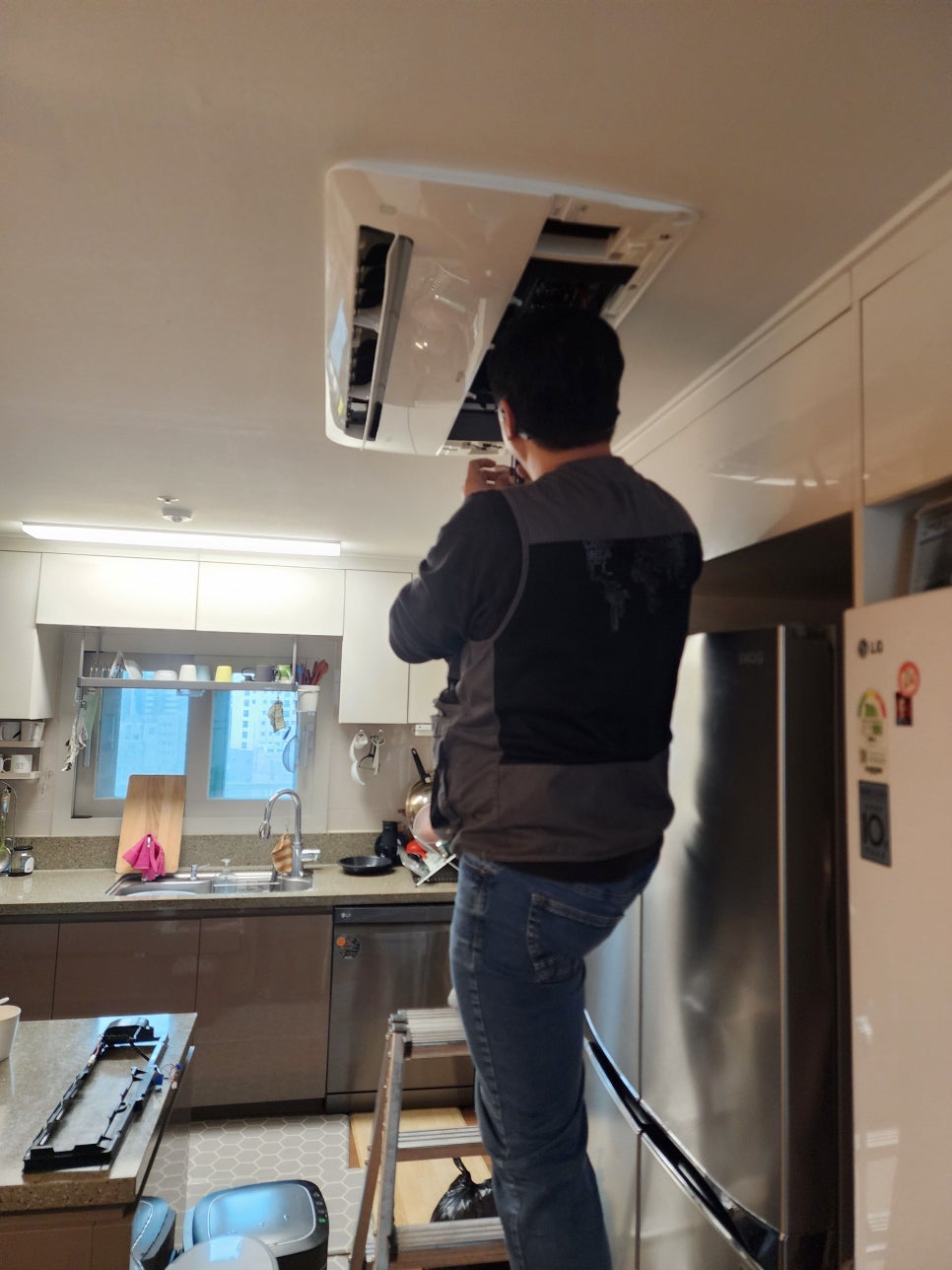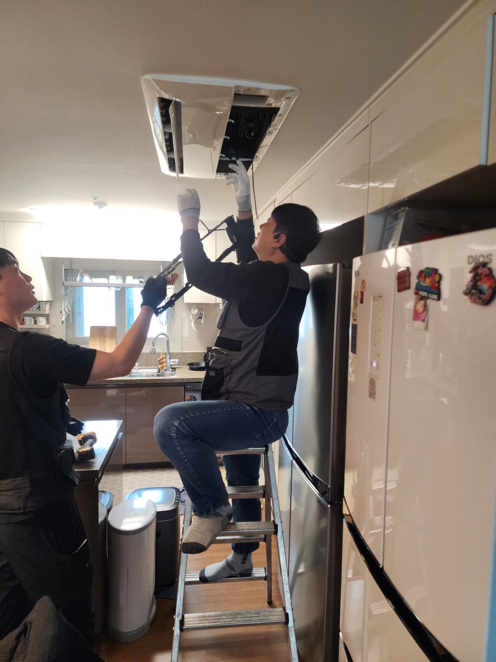 사다리를 이용해 천장 속 실내기에 접근합니다.